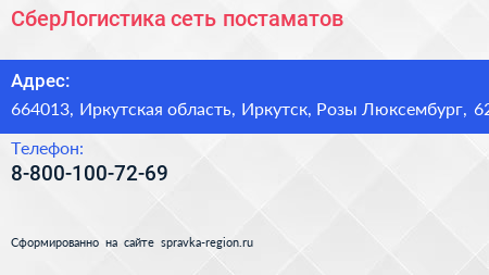 СберЛогистика, сеть постаматов по адресу 664013, Иркутская область, Иркутск, Розы Люксембург, 62 в дальнейшем Организация, размещена в следующих категориях: