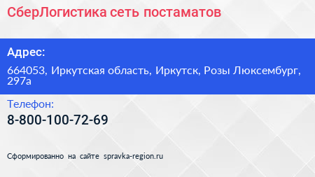 СберЛогистика, сеть постаматов по адресу 664053, Иркутская область, Иркутск, Розы Люксембург, 297а в дальнейшем Организация, размещена в следующих категориях: