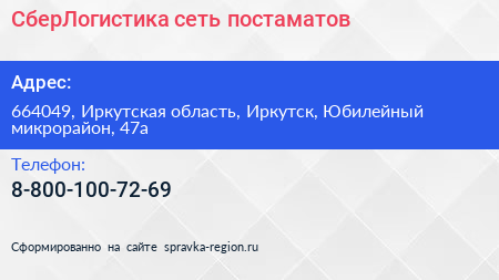 СберЛогистика, сеть постаматов по адресу 664049, Иркутская область, Иркутск, Юбилейный микрорайон, 47а в дальнейшем Организация, размещена в следующих категориях: