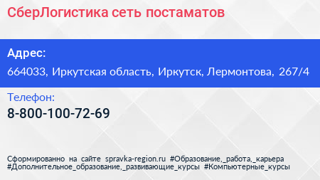 СберЛогистика, сеть постаматов по адресу 664033, Иркутская область, Иркутск, Лермонтова, 267/4 в дальнейшем Организация, размещена в следующих категориях: