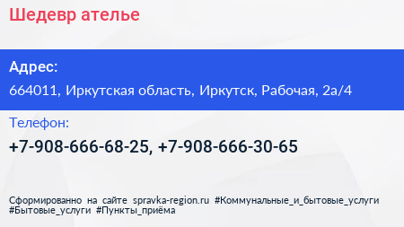 Шедевр, ателье по адресу 664011, Иркутская область, Иркутск, Рабочая, 2а/4 в дальнейшем Организация, размещена в следующих категориях: