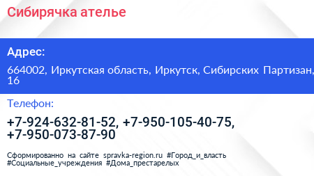 Сибирячка, ателье по адресу 664002, Иркутская область, Иркутск, Сибирских Партизан, 16 в дальнейшем Организация, размещена в следующих категориях: