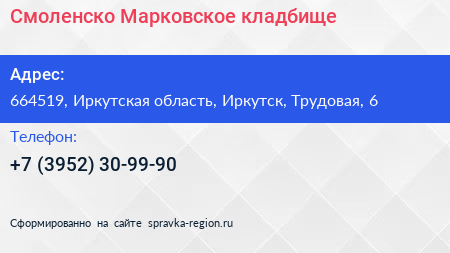 Смоленско-Марковское кладбище по адресу 664519, Иркутская область, Иркутск, Трудовая, 6 в дальнейшем Организация, размещена в следующих категориях: