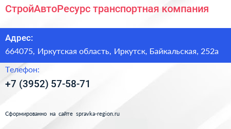 СтройАвтоРесурс, транспортная компания по адресу 664075, Иркутская область, Иркутск, Байкальская, 252а в дальнейшем Организация, размещена в следующих категориях: