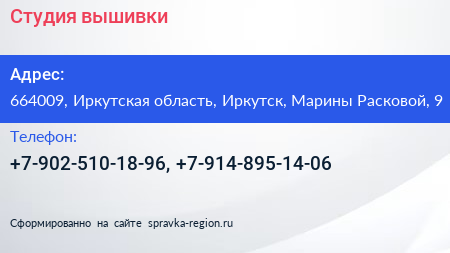 Студия вышивки по адресу 664009, Иркутская область, Иркутск, Марины Расковой, 9 в дальнейшем Организация, размещена в следующих категориях: