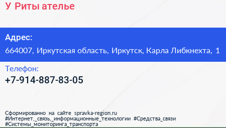 У Риты, ателье по адресу 664007, Иркутская область, Иркутск, Карла Либкнехта, 1 в дальнейшем Организация, размещена в следующих категориях: