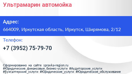 Ультрамарин, автомойка по адресу 664009, Иркутская область, Иркутск, Ширямова, 2/12 в дальнейшем Организация, размещена в следующих категориях: