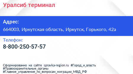 Уралсиб, терминал по адресу 664003, Иркутская область, Иркутск, Горького, 42а в дальнейшем Организация, размещена в следующих категориях: