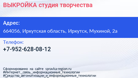 ВЫКРОЙКА, студия творчества по адресу 664056, Иркутская область, Иркутск, Мухиной, 2а в дальнейшем Организация, размещена в следующих категориях: