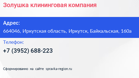 Золушка, клининговая компания по адресу 664046, Иркутская область, Иркутск, Байкальская, 160а в дальнейшем Организация, размещена в следующих категориях: