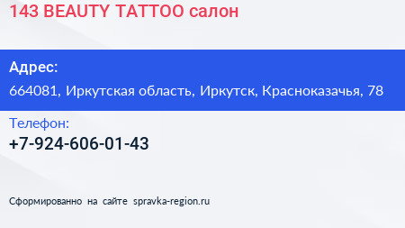 143 BEAUTY & TATTOO, салон по адресу 664081, Иркутская область, Иркутск, Красноказачья, 78 в дальнейшем Организация, размещена в следующих категориях:
