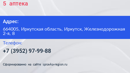 5+, аптека по адресу 664005, Иркутская область, Иркутск, Железнодорожная 2-я, 8 в дальнейшем Организация, размещена в следующих категориях: