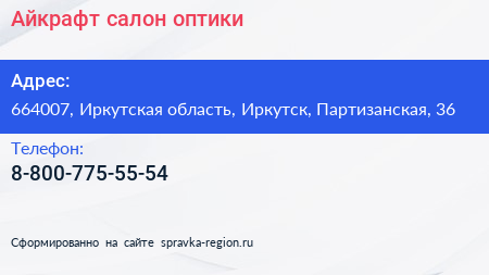 Айкрафт, салон оптики по адресу 664007, Иркутская область, Иркутск, Партизанская, 36 в дальнейшем Организация, размещена в следующих категориях: