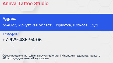 Annva Tattoo Studio по адресу 664022, Иркутская область, Иркутск, Кожова, 11/1 в дальнейшем Организация, размещена в следующих категориях: