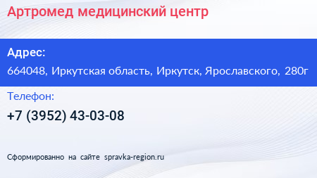 Артромед, медицинский центр по адресу 664048, Иркутская область, Иркутск, Ярославского, 280г в дальнейшем Организация, размещена в следующих категориях: