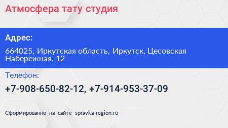 Атмосфера, тату-студия по адресу 664025, Иркутская область, Иркутск, Цесовская Набережная, 12 в дальнейшем Организация, размещена в следующих категориях: