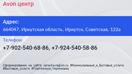 Avon, центр по адресу 664047, Иркутская область, Иркутск, Советская, 122а в дальнейшем Организация, размещена в следующих категориях: