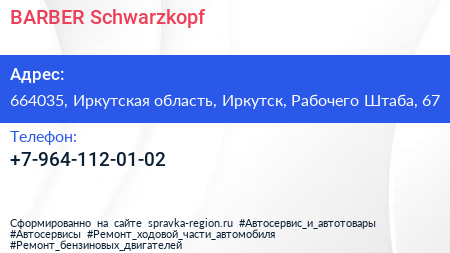 BARBER Schwarzkopf по адресу 664035, Иркутская область, Иркутск, Рабочего Штаба, 67 в дальнейшем Организация, размещена в следующих категориях: