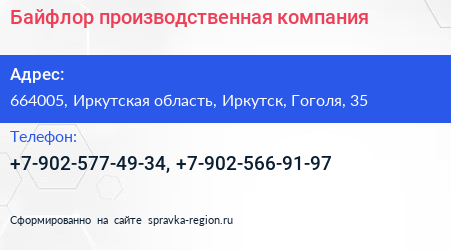 Байфлор, производственная компания по адресу 664005, Иркутская область, Иркутск, Гоголя, 35 в дальнейшем Организация, размещена в следующих категориях: