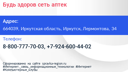 Будь здоров!, сеть аптек по адресу 664039, Иркутская область, Иркутск, Лермонтова, 34 в дальнейшем Организация, размещена в следующих категориях: