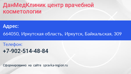 ДанМедКлиник, центр врачебной косметологии по адресу 664050, Иркутская область, Иркутск, Байкальская, 309 в дальнейшем Организация, размещена в следующих категориях:
