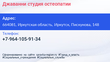 Джаванни, студия остеопатии по адресу 664081, Иркутская область, Иркутск, Пискунова, 148 в дальнейшем Организация, размещена в следующих категориях: