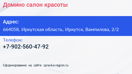 Домино, салон красоты по адресу 664058, Иркутская область, Иркутск, Вампилова, 2/2 в дальнейшем Организация, размещена в следующих категориях: