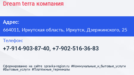 Dream terra, компания по адресу 664011, Иркутская область, Иркутск, Дзержинского, 25 в дальнейшем Организация, размещена в следующих категориях: