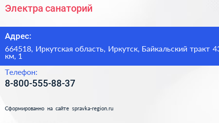Электра, санаторий по адресу 664518, Иркутская область, Иркутск, Байкальский тракт 43 км, 1 в дальнейшем Организация, размещена в следующих категориях:
