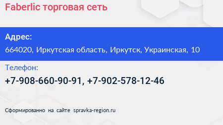 Faberlic, торговая сеть по адресу 664020, Иркутская область, Иркутск, Украинская, 10 в дальнейшем Организация, размещена в следующих категориях: