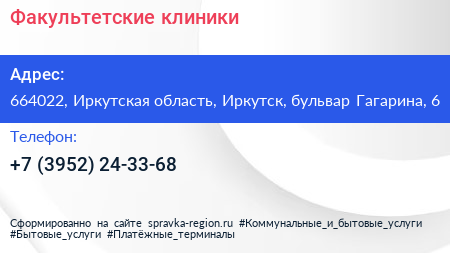 Факультетские клиники по адресу 664022, Иркутская область, Иркутск, бульвар Гагарина, 6 в дальнейшем Организация, размещена в следующих категориях: