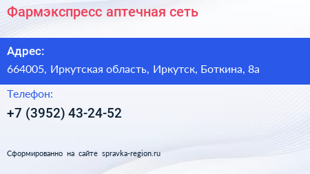 Фармэкспресс, аптечная сеть по адресу 664005, Иркутская область, Иркутск, Боткина, 8а в дальнейшем Организация, размещена в следующих категориях: