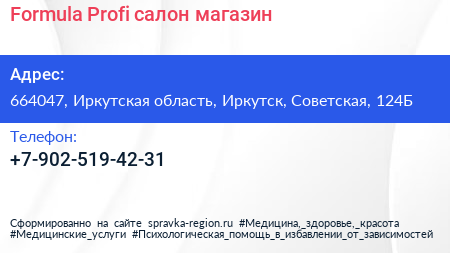 Formula Profi, салон-магазин по адресу 664047, Иркутская область, Иркутск, Советская, 124Б в дальнейшем Организация, размещена в следующих категориях: