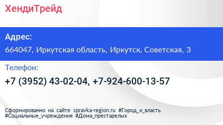 ХендиТрейд по адресу 664047, Иркутская область, Иркутск, Советская, 3 в дальнейшем Организация, размещена в следующих категориях: