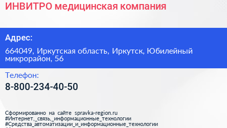 ИНВИТРО, медицинская компания по адресу 664049, Иркутская область, Иркутск, Юбилейный микрорайон, 56 в дальнейшем Организация, размещена в следующих категориях: