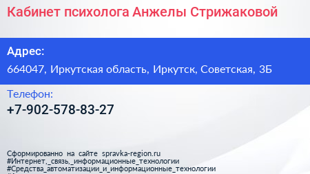 Кабинет психолога Анжелы Стрижаковой по адресу 664047, Иркутская область, Иркутск, Советская, 3Б в дальнейшем Организация, размещена в следующих категориях:
