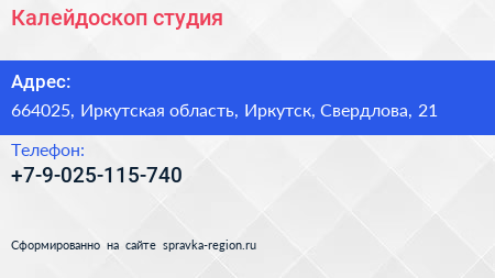 Калейдоскоп, студия по адресу 664025, Иркутская область, Иркутск, Свердлова, 21 в дальнейшем Организация, размещена в следующих категориях: