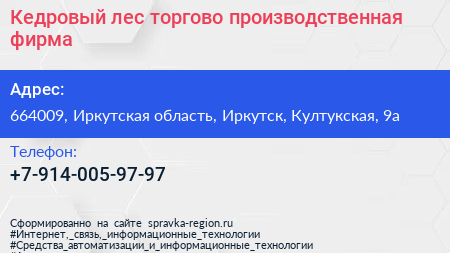Кедровый лес, торгово-производственная фирма по адресу 664009, Иркутская область, Иркутск, Култукская, 9а в дальнейшем Организация, размещена в следующих категориях: