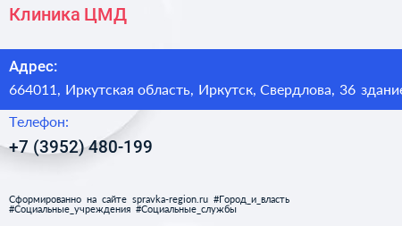 Клиника ЦМД по адресу 664011, Иркутская область, Иркутск, Свердлова, 36 здание в дальнейшем Организация, размещена в следующих категориях: