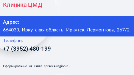 Клиника ЦМД по адресу 664033, Иркутская область, Иркутск, Лермонтова, 267/2 в дальнейшем Организация, размещена в следующих категориях: