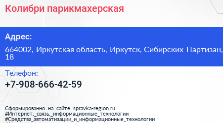 Колибри, парикмахерская по адресу 664002, Иркутская область, Иркутск, Сибирских Партизан, 18 в дальнейшем Организация, размещена в следующих категориях: