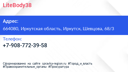 LiteBody38 по адресу 664080, Иркутская область, Иркутск, Шевцова, 68/3 в дальнейшем Организация, размещена в следующих категориях: