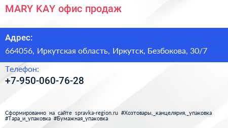 MARY KAY, офис продаж по адресу 664056, Иркутская область, Иркутск, Безбокова, 30/7 в дальнейшем Организация, размещена в следующих категориях: