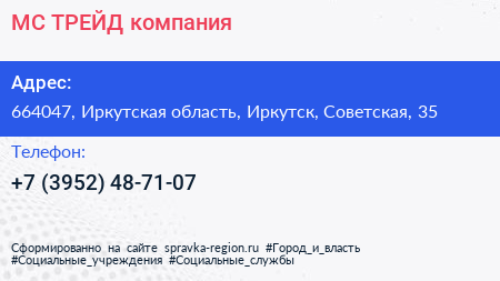 МС-ТРЕЙД, компания по адресу 664047, Иркутская область, Иркутск, Советская, 35 в дальнейшем Организация, размещена в следующих категориях: