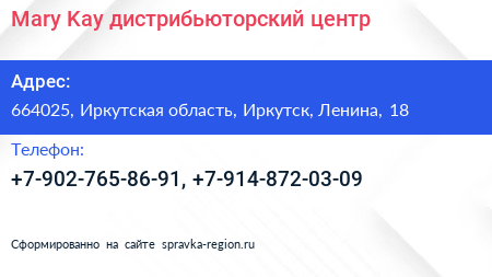 Mary Kay, дистрибьюторский центр по адресу 664025, Иркутская область, Иркутск, Ленина, 18 в дальнейшем Организация, размещена в следующих категориях: