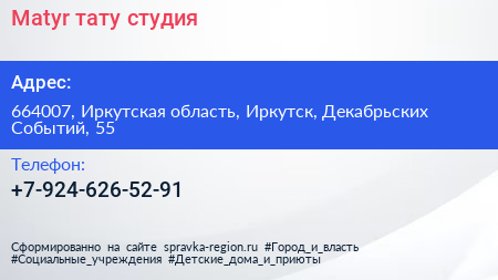 Matyr, тату-студия по адресу 664007, Иркутская область, Иркутск, Декабрьских Событий, 55 в дальнейшем Организация, размещена в следующих категориях: