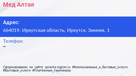 Мед Алтая по адресу 664019, Иркутская область, Иркутск, Зимняя, 1 в дальнейшем Организация, размещена в следующих категориях: