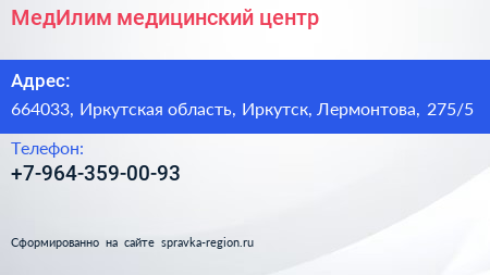 МедИлим, медицинский центр по адресу 664033, Иркутская область, Иркутск, Лермонтова, 275/5 в дальнейшем Организация, размещена в следующих категориях: