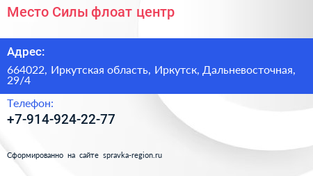 Место Силы, флоат-центр по адресу 664022, Иркутская область, Иркутск, Дальневосточная, 29/4 в дальнейшем Организация, размещена в следующих категориях: