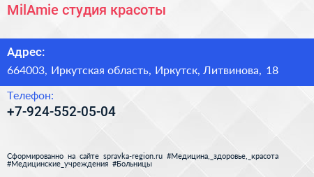 MilAmie, студия красоты по адресу 664003, Иркутская область, Иркутск, Литвинова, 18 в дальнейшем Организация, размещена в следующих категориях: